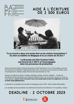 Dans le cadre de l'édition 2023 du Brussels Art Film Festival (du 15 au 19 novembre), le Centre du Cinéma de la Fédération Wallonie-Bruxelles offre une bourse d’un montant de 2.500 € visant à récompenser le meilleur projet d'écriture de documentaire sur l’art.